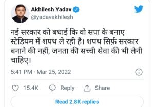 उन्होंने ट्वीट किया कि नई सरकार को बधाई कि वो सपा के बनाए स्टेडियम में शपथ ले रही है। शपथ सिर्फ सरकार बनाने की नहीं, जनता की सच्ची सेवा की भी लेनी चाहिए।