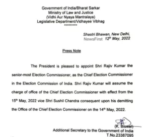 नियुक्ति: गुरुवार को न्याय एवं विधि मंत्रालय ने एक नोटिफिकेशन जारी बताया कि राजीव कुमार देश के अगले मुख्य चुनाव आयुक्त होंगे। इसमें कहा गया कि राष्ट्रपति ने चुनाव आयोग के सबसे वरिष्ठ आयुक्त राजीव कुमार को इस पद पर नियुक्त किया है। वे 15 मई को सीईसी का पद संभालेंगे। गौरतलब है कि मौजूदा सीईसी सुशील चंद्रा 14 मई को रिटायर हो रहे है।