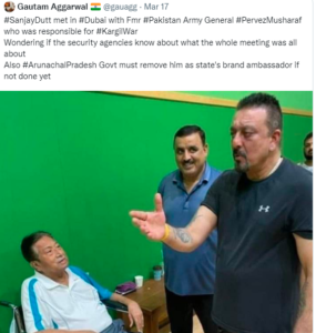 जिसमें वह पाकिस्तान के पूर्व राष्ट्रपति परवेज मुशर्रफ के साथ खड़े होकर बात करते दिख रहे हैं। इस तस्वीर में परवेज मुशर्रफ व्हीलचेयर पर बैठे हैं और संजय दत्त खड़े हुए हैं। इस तस्वीर को लेकर उन ggको जमकर ट्रोल किया जा रहा है। इस तस्वीर को शेयर करते हुए एक यूजर ने लिखा- दुबई में मुशर्रफ के साथ संजय दत्त… एक बॉलीवुड अभिनेता का कारगिल के मास्टर माइंड से क्या लेना-देना है। संजय दत्त को सिर्फ ड्रग्स, शराब, बंदूकें और दाऊद इब्राहिम पसंद है।