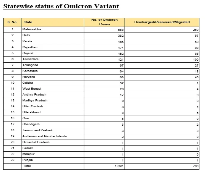 स्वास्थ्य मंत्रालय के अनुसार देश में ओमिक्रॉन संक्रमितों की कुल संख्या बढ़कर 1,892 हो गई है। 568 मामलों के साथ महाराष्ट्र पहले स्थान पर बना हुआ है वहीं 382 मरीजों के साथ दिल्ली दूसरे स्थान पर है। 185 मामलों के साथ केरल तीसरे स्थान पर बना हुआ है।  ओमिक्रॉन के 1,892 मरीजों में से 766 मरीज़ रिकवर हो गए हैं।