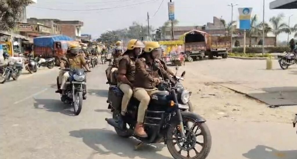 थाना बृजमनगंज, जनपद महराजगंज: होली पर्व को शांतिपूर्ण एवं सकुशल सम्पन्न कराने के उद्देश्य से थाना क्षेत्र बृजमनगंज में पुलिस द्वारा फ्लैग मार्च किया गया।