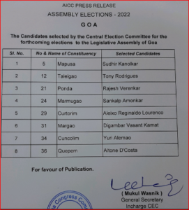 गोवा में अगले साल होने वाले विधानसभा चुनाव के लिए कांग्रेस ने पहली सूची जारी कर दी है। कांग्रेस की ओर से जारी की गई सूची में आठ विधानसभा सीट के लिए उम्मीदवारों का एलान किया गया है। इसमें पूर्व मुख्यमंत्री दिगंबर कामत को मडगांव विधानसभा सीट से टिकट दिया गया है।