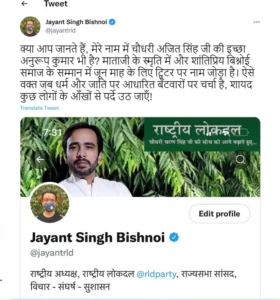 पंजाबी गायक सिद्ध मूसेवाला की हत्या में लॉरेंस बिश्नोई का नाम आने के बाद बिश्नोई समाज को सोशल मीडिया पर निशाना बनाया जा रहा है। ऐसे में रालोद अध्यक्ष एवं राज्यसभा सांसद जयंत सिंह ने समाज के सम्मान में एक महीने के लिए अपने ट्वीटर पर खुद का नाम जयंत सिंह बिश्नोई रखा है।