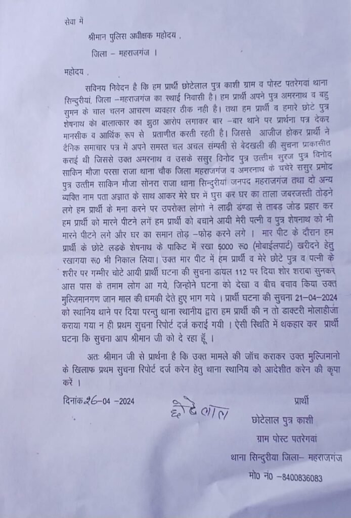 सिंदुरिया थानाक्षेत्र के ग्राम पतरेंगवा निवासी एक व्यक्ति ने पुलिस अधीक्षक को तहरीर देकर कहा है की उसकी बहू और उसका पति अमरनाथ दोनो मिलकर मुझे तथा मेरे छोटे लड़के शेषनाथ के ऊपर बलात्कार का झूठा आरोप लगाकर फर्जी तरीके से फ़साना चाहते है तथा बार बार थाने मे हमारे विरुद्ध शिकायत करते रहते है जिससे वह मानसिक और आर्थिके रूप से तंग हो गया है।