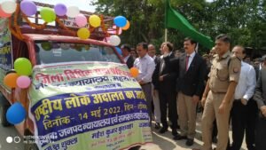 महराजगंज: जनपद महराजगंज में 14 मई 2022 को जिला विधिक सेवा प्राधिकरण के तत्वाधान में राष्ट्रीय लोक अदालत का आयोजन किया जाना है। महराजगंज में भी जनपद न्यायालय परिसर में लोक अदालत का आयोजन होना है । जिसमें ई चालानों से संबंधित वादों का निस्तारण किया जाना है। साथ ही अन्य वादों का निस्तारण भी इस लोक अदालत में किया जाना है। लोक अदालत को लेकर जनपद के लोगो में जागरुकता फैलाने हेतु आज दिनांक 06.05.2022 को एक कार्यक्रम में जनपद मुख्य न्यायधीश श्री जयप्रकाश तिवारी, जिलाधिकारी श्री सतेन्द्र कुमार झा व पुलिस अधीक्षक डा0 कौस्तुभ द्वारा संयुक्त रुप से जागरूकता वाहन को हरी झण्डी दिखाकर रवाना किया गया।