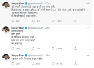आज सुबह-सुबह ईडी के अधिकारी संजय राउत के घर पहुंच गए। उनसे घर पर ही पूछताछ जारी है। इस बीच संजय राउत ने ट्वीट किया है। उन्होंने अपने ट्विटर हैंडल पर लिखा है, मेरा किसी घोटाले से कोई लेना-देना नहीं है। यह मैं शिवसेना प्रमुख बालासाहेब ठाकरे की शपथ लेकर कह रहा हूं। बालासाहेब ने हमें लड़ना सिखाया है। मैं शिवसेना के लिए लड़ना जारी रखूंगा।