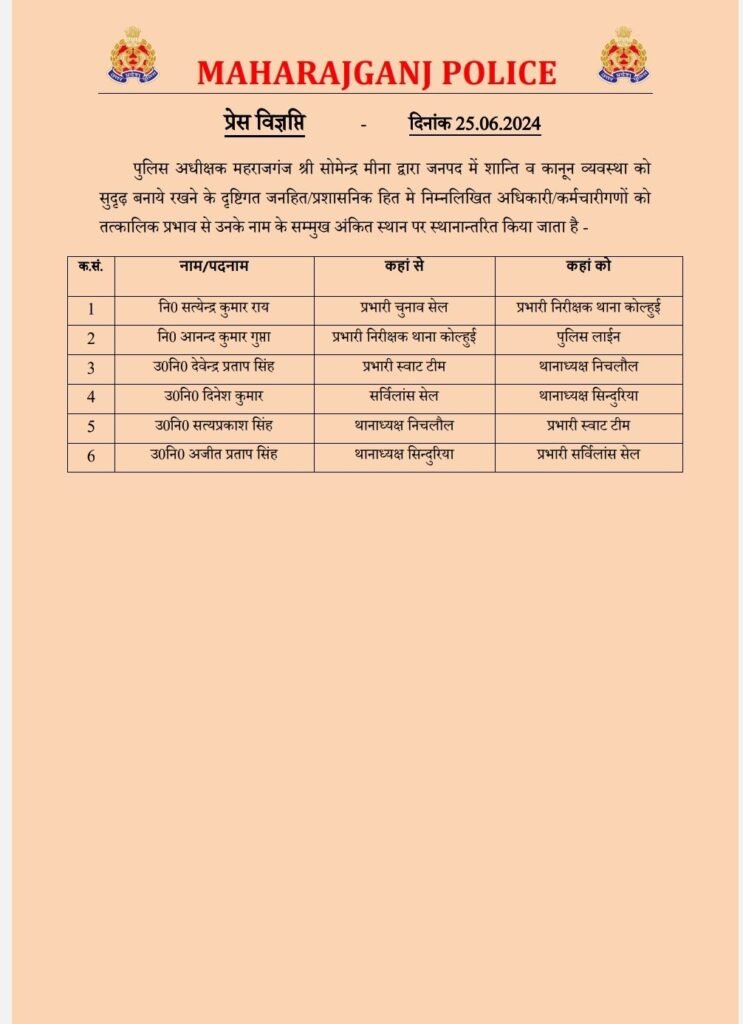 Maharajganj पुलिस अधीक्षक महराजगंज ने 2 निरीक्षक और 4 उपनिरीक्षक का किया स्थानांतरण By ARATI VERMA Posted on June 26, 2024 Share Tweet Share Share Email Comments पुलिस अधीक्षक महराजगंज ने 2 निरीक्षक और 4 उपनिरीक्षक का स्थानांतरण किया। Post Views: 985 Related Items: Share Tweet Share Share Email Click to comment Leave a Reply Cancel replyYour email address will not be published. Required fields are marked *Comment * Name * Email * Website Save my name, email, and website in this browser for the next time I comment.