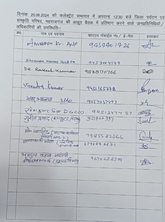 महराजगंज: महराजगंज 25 जून 2024 , जिला पर्यटन एवं संस्कृति परिषद महराजगंज की बैठक जिलाधिकारी/ उपाध्यक्ष जिला पर्यटन एवं संस्कृति परिषद (शासी निकाय) की अध्यक्षता में सम्पन्न हुई।