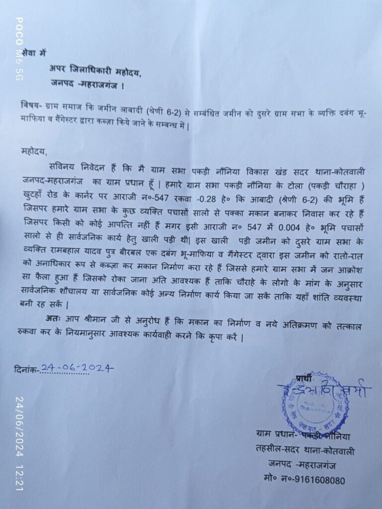 महराजगंज: महराजगंज नौनिया चौराहे पर सार्वजनिक जमीन पर कब्जा करने के संबंध में इन्द्रमानी वर्मा ग्राम प्रधान ने डीएम को दिया पत्र ग्राम प्रधान ने बताया कि पकड़ी नौनिया के टोला पकड़ी चौराहा खुटहा मार्ग के कॉर्नर पर आराजी नंबर 547 रकबा 28 हेक्टेयर की आबादी भूमि है। जिस पर हमारे ग्राम सभा के कुछ व्यक्ति 50 सालों से पक्का मकान बनवाकर निवास कर रहे हैं।